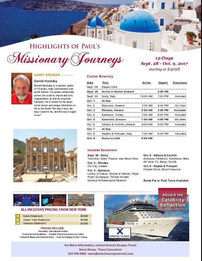 Your trip will begin in Rome where you will embark on the Celebrity Reflection to visit Sicily with tours of Taormina, the Greek Theatre and view Mount Etna. Then you will travel to Mykonos, Greece for a day of sightseeing on your own before heading to Rhodes, Greece where you will visit the Old City. After departing Rhodes you will spend a day in Ephesus where you will visit numerous sights including the Temple of Hadran, the Royal Road and the Synagogue. After the exciting day in Ehpesus, you will visit beautiful Santorini, Greece where you have a day of sightseeing on your own. Then you will visit Athens & Corinth Greece where you will visit the Acropolis, the Parthenon, Mars Hill (Acts 17) before visiting Corinth. Finally you will enjoy the final tour day visiting Naples and Pompeii before returning to Rome for your flight home.