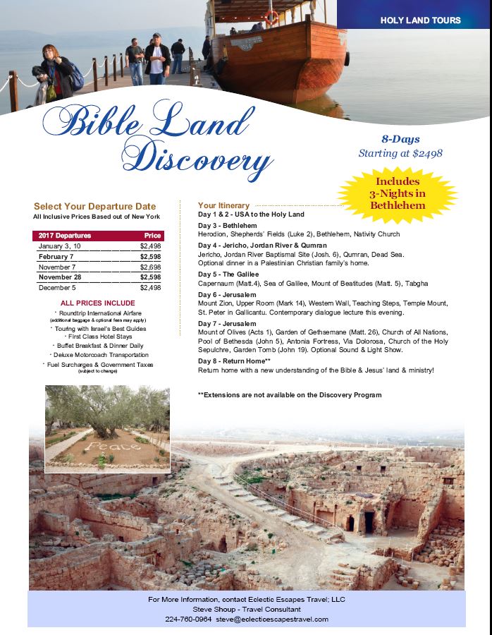 The following morning you will begin your trip home with a new understanding of the Bible and Jesus' land and ministry.
