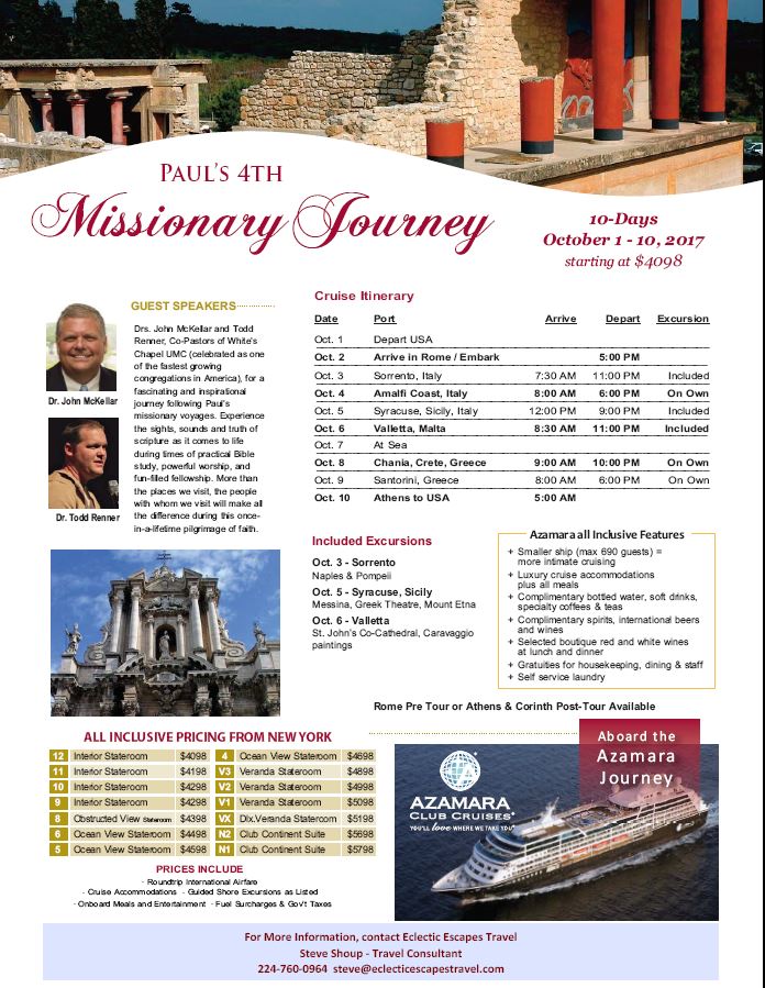 Depart the USA to visit the areas where Paul travelled during his 4th Missionary Journey with Guest Speakers Dr. John McKellar and Todd Renner, Co-Pastors of White's Chapel UMC for an inspirational journey onboard the Azamara Journey. Azamara cruises have many all inclusive features to make this a comfortable journey. They feature a smaller ship with a maximum of 690 guests which makes for a more initimate cruising experience.